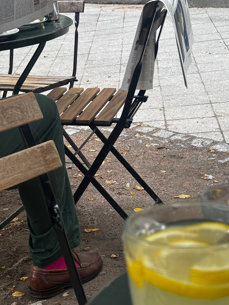 Gestern sah ich einen Mann mit nadelbaumgrüner Hose, neonrosa Socken und kastanienbraunen Loafers. Das waren die drei Farbsequenzen, die ich zunächst wahrnahm. Er las Zeitung.